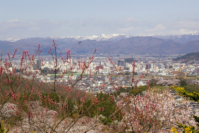 残雪の吾妻山と眼下の福島市