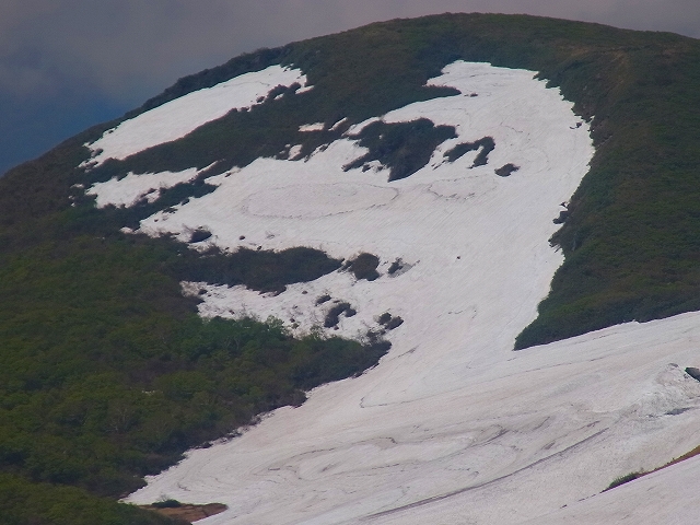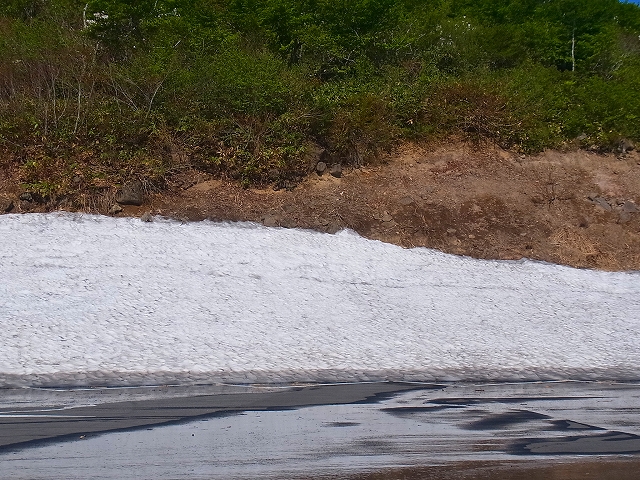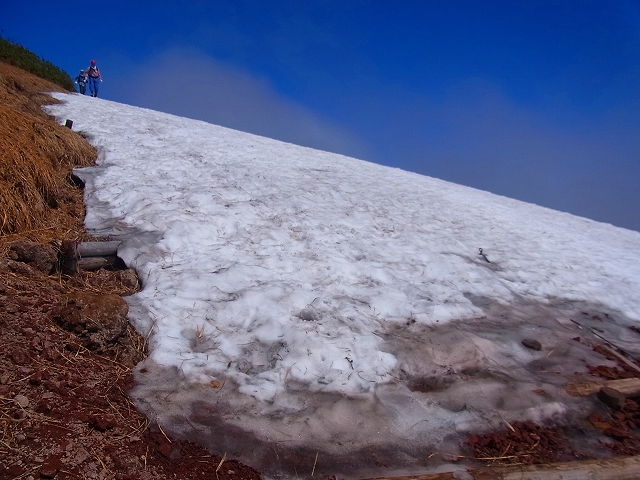 頂上付近の雪渓、アイゼンもピッケルもないので渡るのは怖かったですが・・・