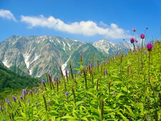 広い尾根から目の前にどーん、と見える北アルプスの巨峰・・・白馬岳、五龍岳、不帰キレットetc..