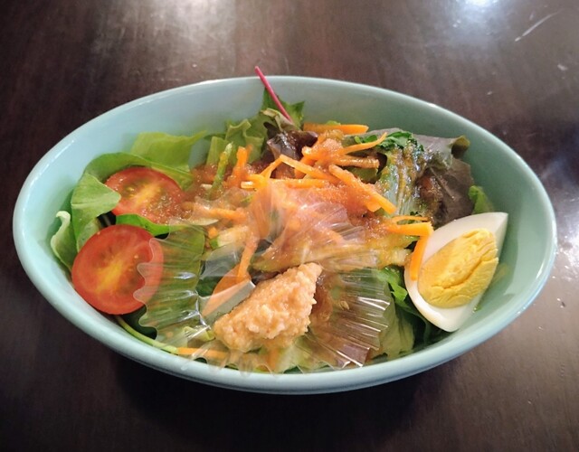 待つことしばし、まず、ガドガドサラダから。生野菜サラダなのでインドネシアのガドガドとは異なりますが、甘辛のピーナッツソースを掛けるところは共通していますか。野菜は少し草臥れ気味でした。