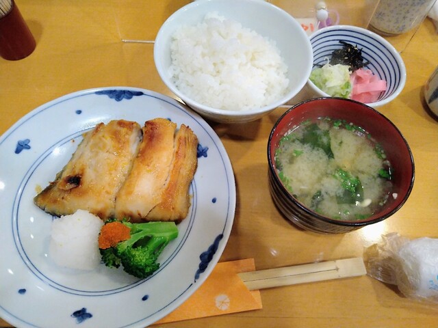 6種類のランチメニューの内、カレイの煮付けと銀ヒラスの照焼は既に売切、残るも美味しそうなものばかり並ぶ中、迷った末にサワラの塩麹焼(税込1,400円)を注文しました。7〜8分待って料理が提供。焼物2切れに大根おろしと温野菜、トビコが添えられていて彩りも鮮やかです。厚みもある焼物は、サワラ特有の繊維っぽさを感じることなく、身が締まり、ジューシーで味醂の甘みに味も円やか。皮まで美味しく完食です。ツヤツヤした真っ白なご飯はおかわり一回無料、瑞々しいお漬物も一級品。ご飯が進み、主役の美味しを際立たせていた事は言うまでもありません。