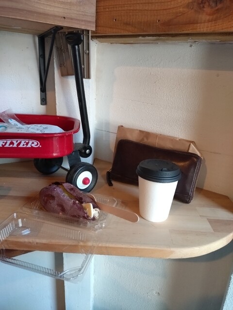 焼き芋2本と塩バターとカフェオレ。