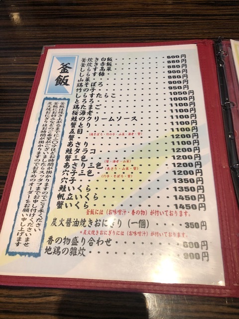 店内へ入店し早速にメニューを見ると沢山の釜めしがあり迷ってしまう