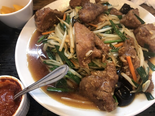 出てきたレバニラはもやし、にらがたんまりと使用され