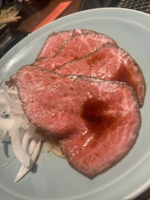 焼き肉屋として完成されている。キムチ盛りローストビーフ特上牛タンハラミユッケしそチキンバジルミノライス卵スープ