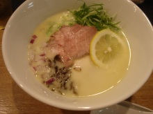 一見こってり系かなと思ったけどレモンスライスが入っていてあっさりしています。コラーゲンたっぷりの素材にもこだわった新感覚のラーメンです。