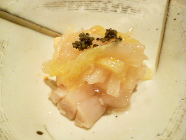 お店の方に撮っていただきました写真をアップしますが、お皿のメモは残していません。いくつかのアミューズの後、キャビア、鴨のジュレとフォワグラ、オマールエビ・マッシュルーム・トリュフ、ジロール茸と味噌のソース・ルッコラとニョッキ等を楽しみました。