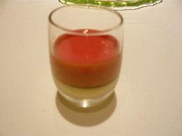 (3品目のアミューズは、ハマグリの入った一品、下はバージンオイルのゼリー。とても爽やかな味わいが夏らしくて素敵です。)