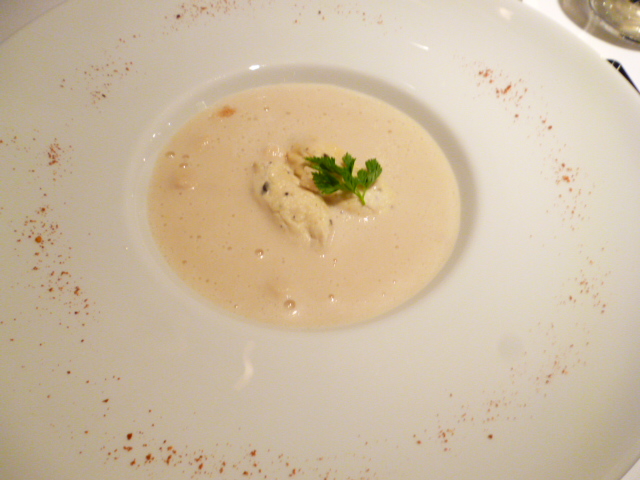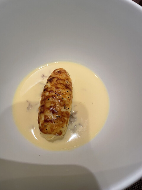 新玉ねぎスープとトリュフの香る地鶏のクネルを添えて