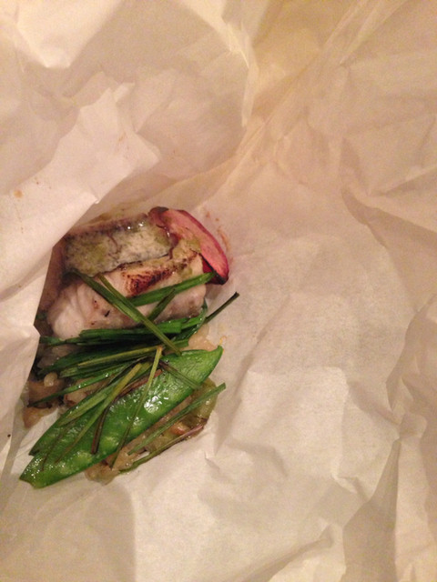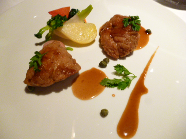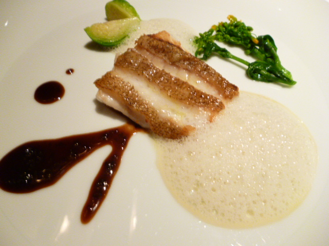 キハタのポワレをシェリービネガーで、鶏から取ったジュでいただきます