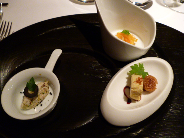 アミューズは、白エビのフリット、日南鶏のタルタル、フォワグラ