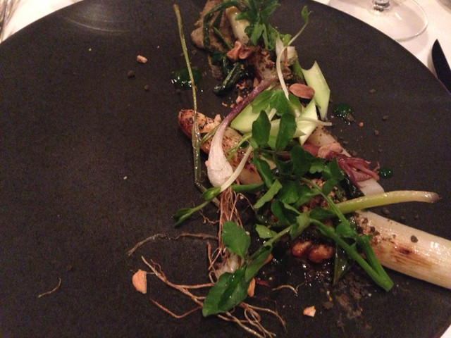 ホワイトアスパラガスのロースト、フキノトウのソース、ニンニク、エシャロットの風味で