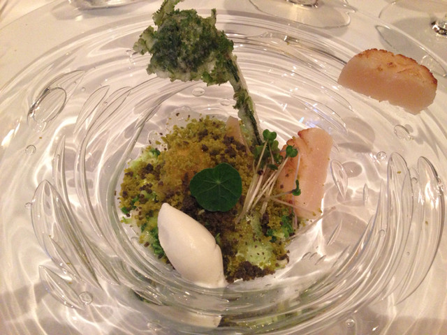 こごみのブランマンジェにうどのアイス、レモングラスのジュレ、ホタテのソテー
