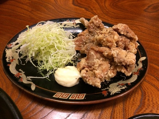 鳥の唐揚げは、独特で厚みのある衣に包まれており歯応えもよく大変美味しいです。(3.9)