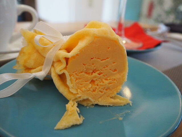 底には、ビスキュイジョコンド、中にはタイベリーのソルベ、まわりをピスタチオのアイスクリームが覆っています。