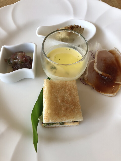 彩り野菜のキッシュ、チキンのパテ、砂肝、オードブルとして普通に美味しい。飲み物はシャンパン、良い感じ。地ビールらしきものがあり、テラスグループで作っている地ビールであったが、これが超ウマ、お土産に買って帰った。
