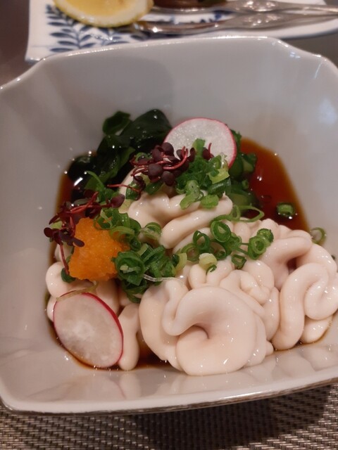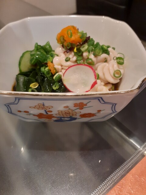 旨い❗美しい❗野里たけさんのメニューに、確かご飯ものは無かった様に思ったけど(間違ってたらごめんなさい)、わざわざこの突き出しの為だけにご飯を炊かれたのかな?毎回ビックリさせられる。今日の海鮮サラダには大振りな柳たこ、金目鯛の炙り、汐っこ(カンパチの若魚?)が入っていた。そのどれもが、ビックリする程美味しかった。どちらかと言うと、刺身喰いでは無い私ですら、その新鮮さ、美味しさに感動してしまう。
