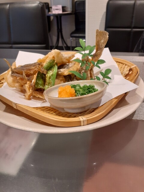 マメ鯵の唐揚げのお通し、カレイの姿揚げ、海老のすり身と椎茸、三重県産のゴマサバの浅〆、生ザーサイを頂く。