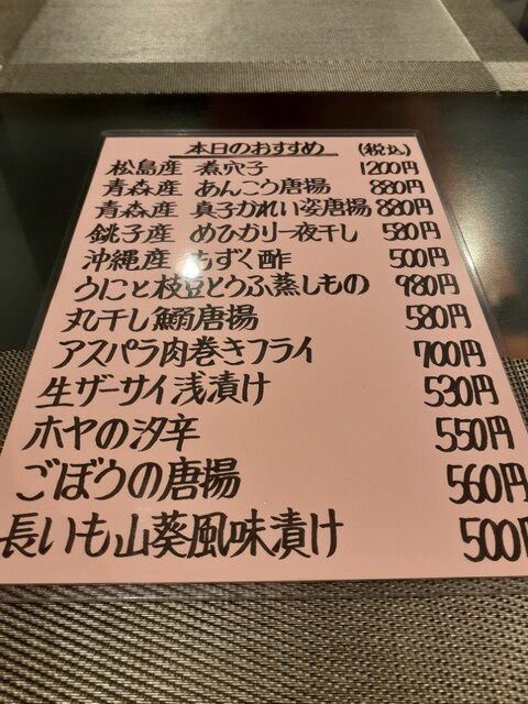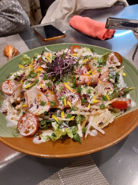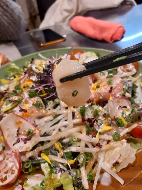 まずは突出しの『白子の揚げ出し』、トロットロの熱々、旨い❗『煮穴子』、上品で旨味が強い、旨い❗『真鯛兜の塩蒸し』、凄く上品な出汁にホロホロの真鯛の兜、旨い❗『スジ肉大根』、何?このお味は❗上品な味で、とても手がかかっているのが分かる。旨い❗特筆すべきは『海鮮サラダ』、これでもか、これでもかと上質の刺身がゴロゴロ入っている。旨い❗だけど流石にこれは利益度外視過ぎ(^^)、客としては嬉しいけれど(^^)