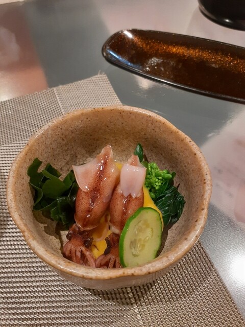 この日のお通しは『ホタルイカと菜の花の辛子味噌』、季節感たっぷりの一品。上品なお味で気分が高まる。因みに予約の無い客にはお通しは出ません。予約に合わせて最良の料理をご用意されているからなのでしょう。