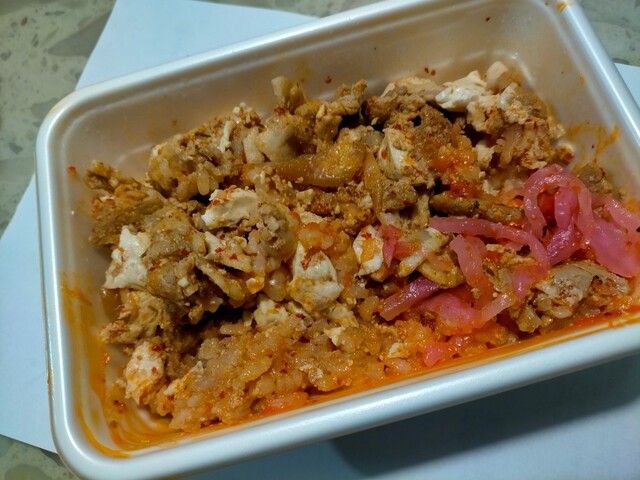 女性スタッフに尋ねると、豚肉と豆腐を辛く味付けした丼なんだとか。