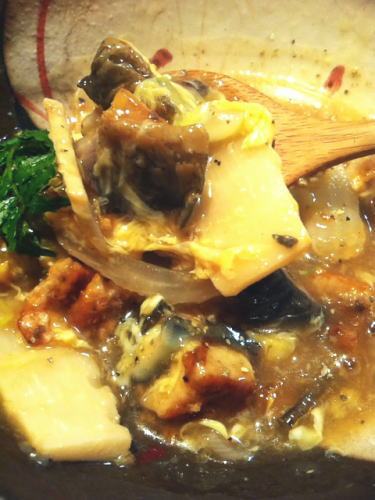 鰻と春野菜の卵とじ(新玉ねぎと筍)いつもは白魚なんだけど、今日は入らなかったらしい。