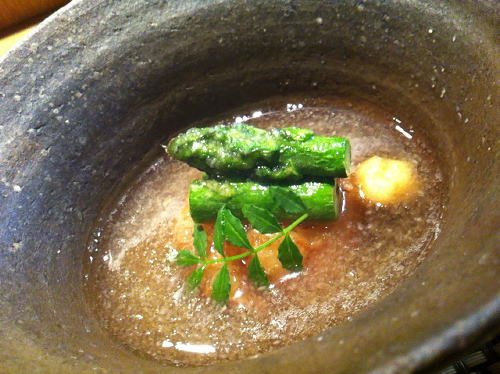 新ジャガの海老しんじょうアスパラ添えあんかけ。