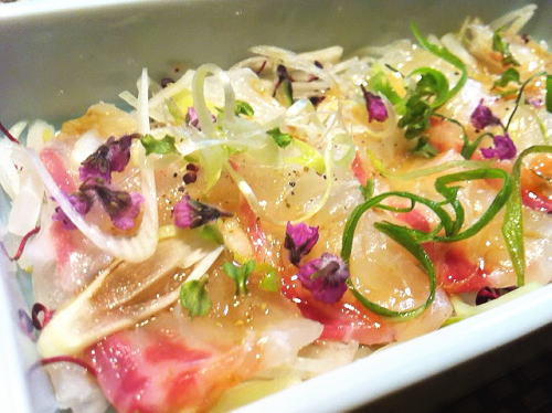 鯛と九条ネギのお造りサラダ仕立てオイル醤油がけ