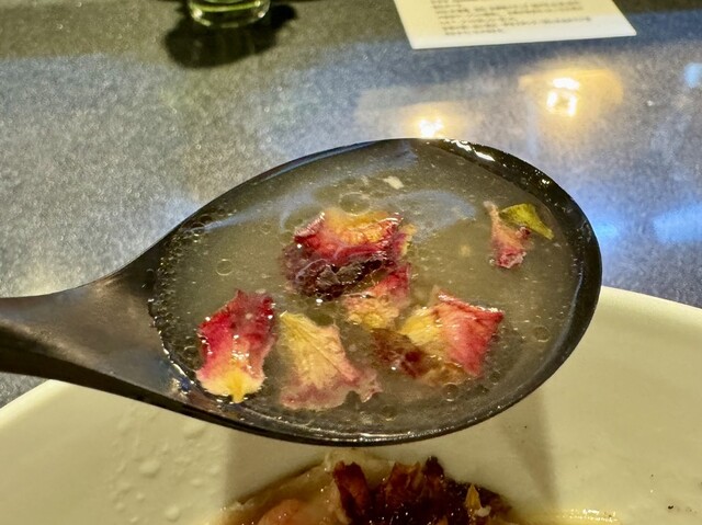 スープを一口飲むと、軽やかな口当たりに華やかな味わいが広がります。
