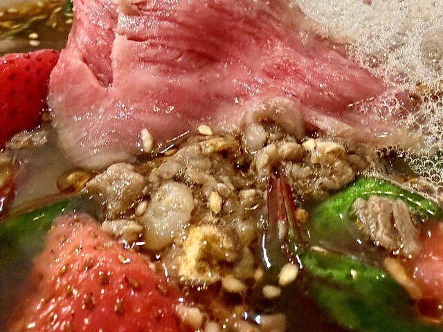 丼にはトマトベリーの泡、イチゴ、ベビーリーフ、和牛など美しい盛り付け。