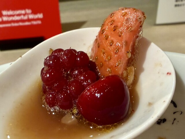 そこに今回は、イチゴやラズベリーなど数種ベリーのマリネが酸味と食感のアクセントを与えています。