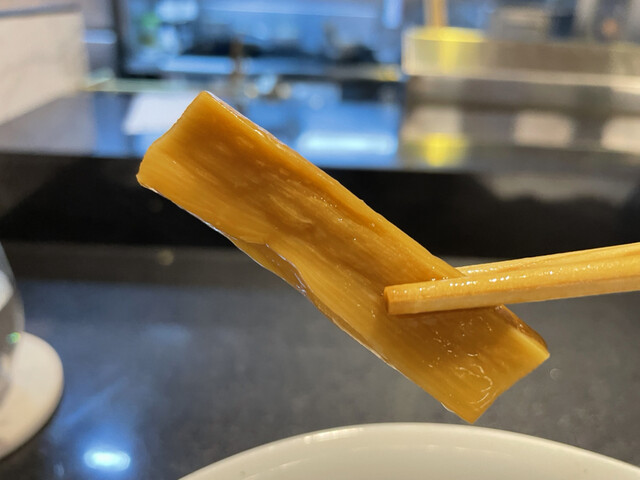 出汁の染みた太メンマや質の良い九条ネギ、品川江戸前海苔など具材も光ります。