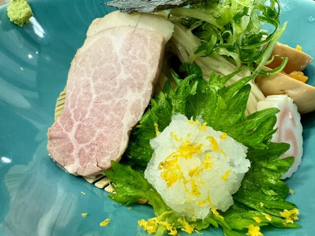 チャーシューは岩中豚の薄切りに短冊ブロック。