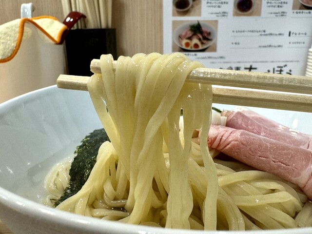 麺はモチモチとして粘りも感じるストレート細麺。