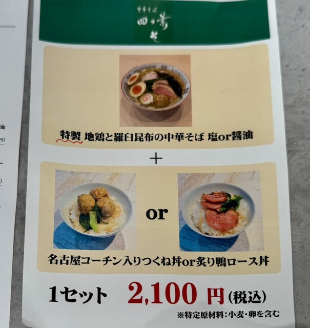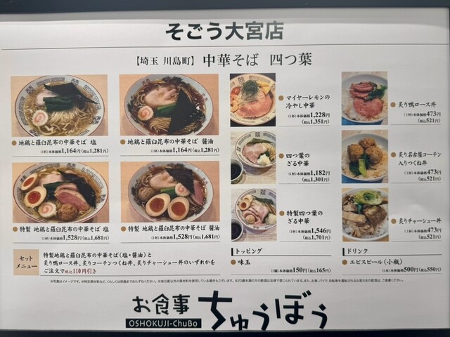 「炙り鴨ロース丼」などご飯ものもあり、「中華そば」とのセットは110円引きです。