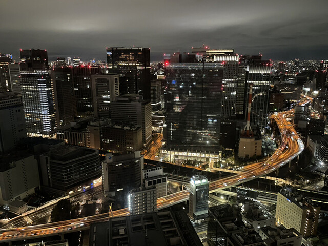 一面ガラス張りの窓は日本銀行を見下ろす方角で、夜は高速道路のヘッドライトが美しいです。