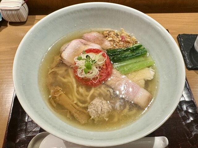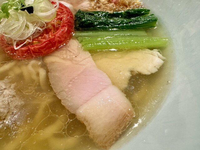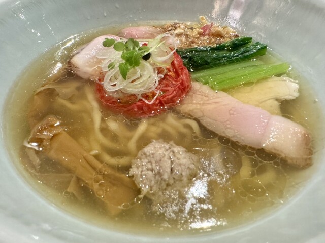 澄んだスープに3種チャーシュー、鶏団子、穂先メンマ、ローストトマト、粒胡椒、生姜餡。