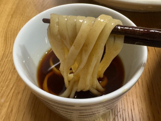 このつけ汁に麵を浸けると、ただでさえモチモチの麺が溶ける様な食感に変化します。