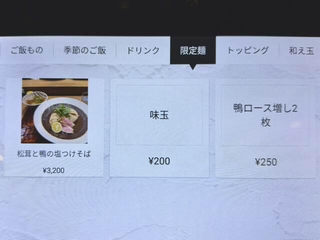 「松茸と鴨の塩つけそば」3200円+「鴨ロース増し2枚」250円