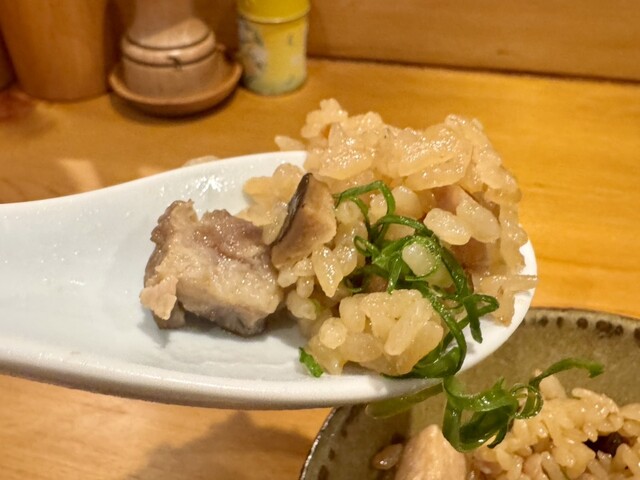 箸切れチャーシューや干しシイタケを煮干しスープ等で炊き込んだご飯です。