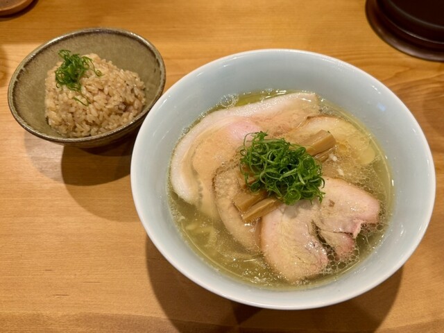 現在「しば田」史上一番ダイナミックで旨い 「塩そば(太麺)」+「内モモチャーシュー1枚」、「炊き込みご飯」