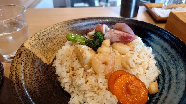 シーフードと揚げ野菜の旨味が、出汁ご飯に染みてて