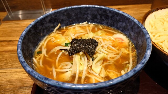 麺を食べ終わって、とろろがまだいっぱいのスープを。