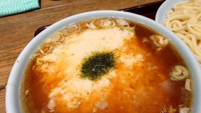 とろろが入っている、つけ汁がなみなみと。