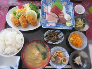 豚肉のクリーム煮、エビフライ、もう1つはカキフライだったかな・・・