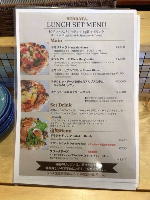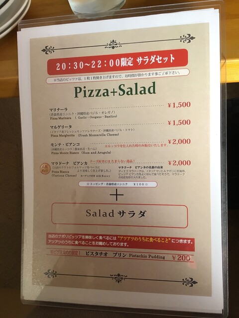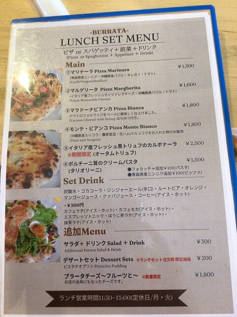 他にはイタリア産ブラータとメロン(1800円)、もずくのペペロンチーノ(500円)、ラクレットチーズのピッツァ(3500円)、マルゲリータ(1700円)、アグーソーセージ(800円)を注文しました。