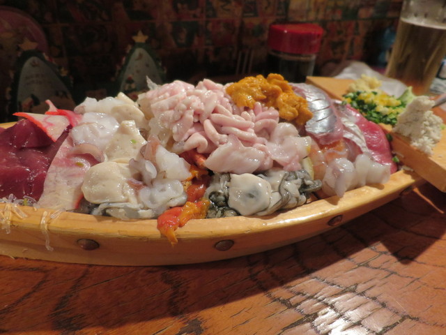 民宿で出ていくる大盛というよりも、舟に魚を山ほど盛り付けている