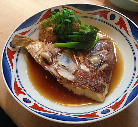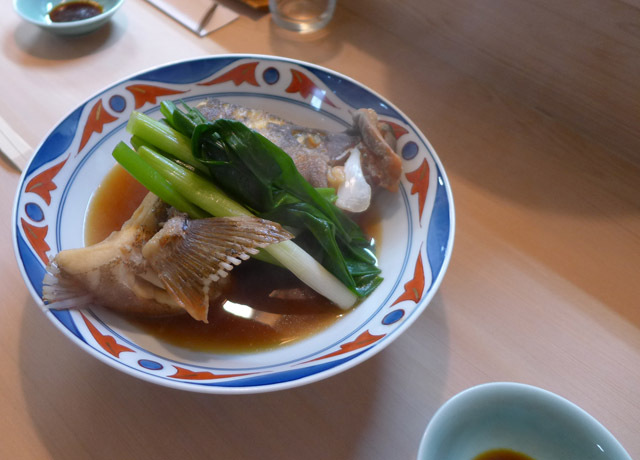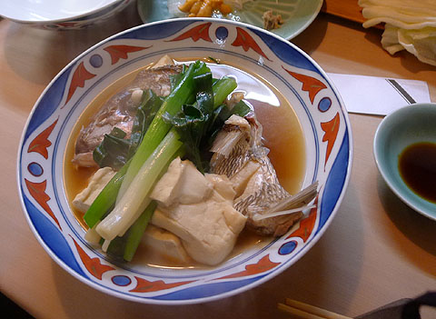 鯛の頭の煮付け。豆腐とネギがこれまたおいしい。
