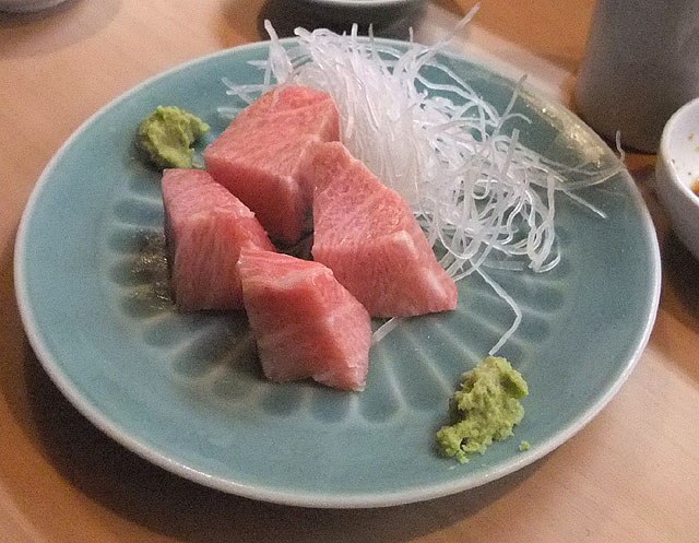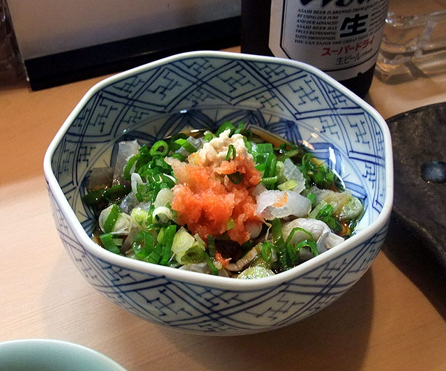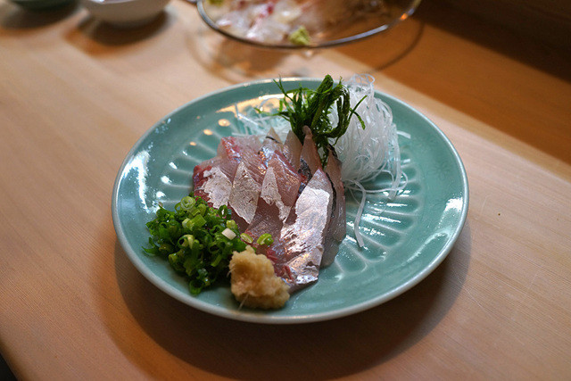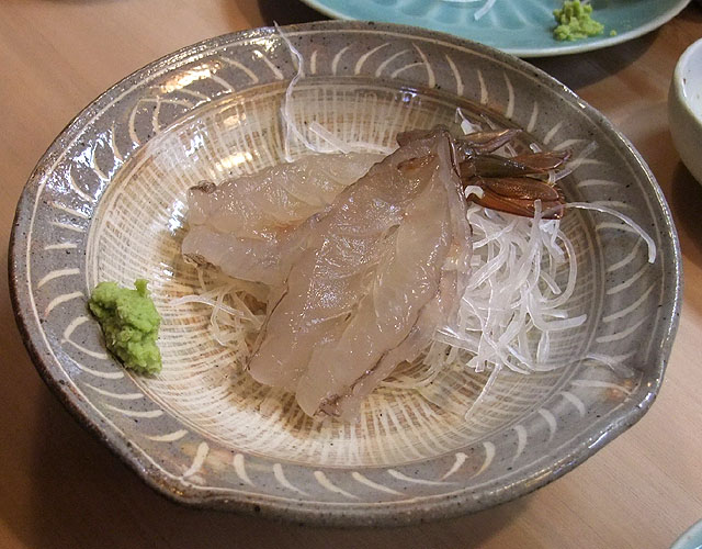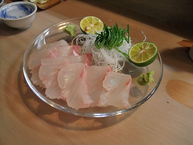 そしてあこう鯛の刺身。新鮮でしゃきしゃきとした身がたまらない。刺身の好みは人それぞれで、しばらく置いて柔らかくなった身がイイという人もいれば、新しいゴリゴリするくらいの方がウマいという人もいるのだが、私は後者なのでこのお店のネタと指向が合っている。