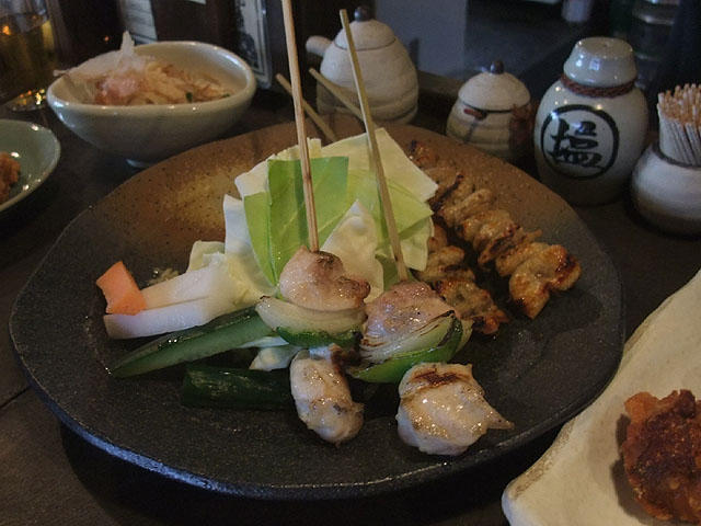 ここの焼き鳥はたれ焼きではなく、塩焼きだ。焼いた串を乗せる大皿には三杯酢みたいなタレが少々入っていて、その上に野菜が盛られている。焼かれた串焼きは一旦ここに全部のせられるので、そのタレを付けながら食べるということらしい。串焼きにはほどよい塩加減がしてあるので、たれは付けなくてもおいしい。